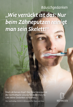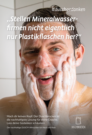 Motto der Kampagne sind „Duschgedanken“. Jeder kennt sie, jeder hat sie. Man kann seine Gedanken in der Dusche schäumen lassen, da man sich mit dem Duschbrocken keine Sorgen mehr um die Nachhaltigkeit in seiner Dusche machen muss.